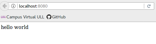 var express = require('express') var app = express() // respond with "hello world" when a GET request is made to the homepage app.get('/', function (req, res) { res.send('hello world') })Al ejecutarlo imprimirá 'hello world' en la ventana del navegador al realizar una petición GET a la página de inicio.